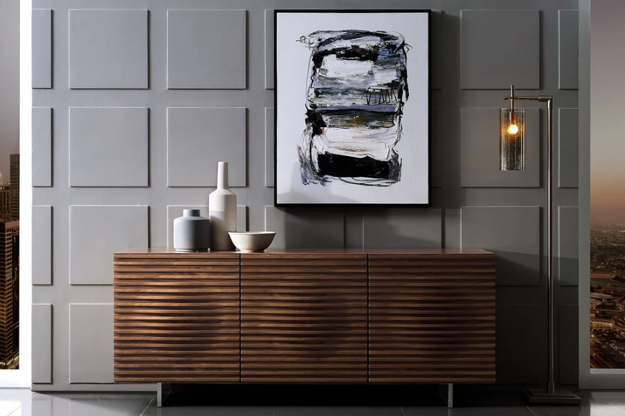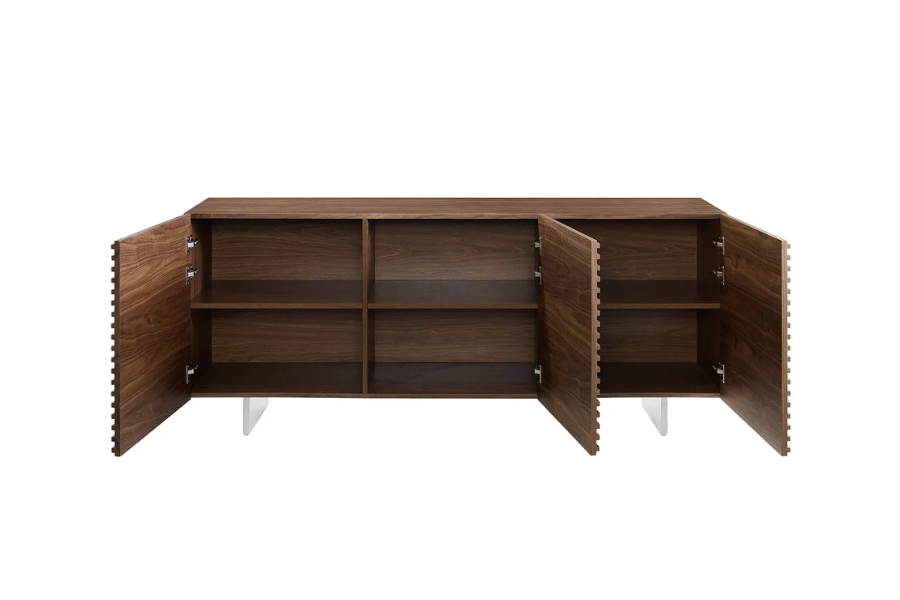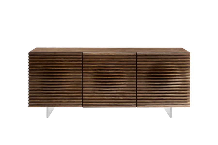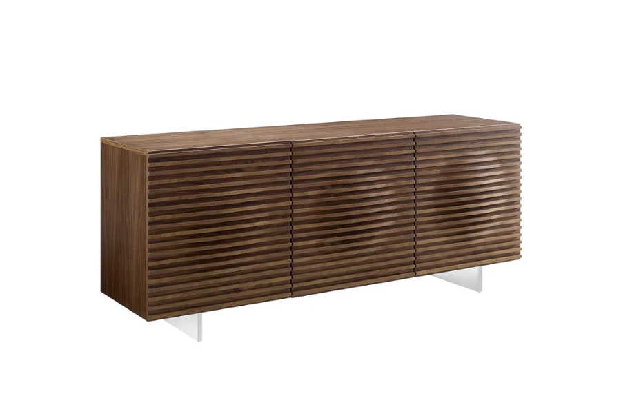 Venini furniture Moon buffet in walnut veneer with storage offers a blend of adaptable style and comfort boasting a modern design that seamlessly complements your home decor. This Moon buffet features three soft closing cabinets adding elegance with functionality to your space.