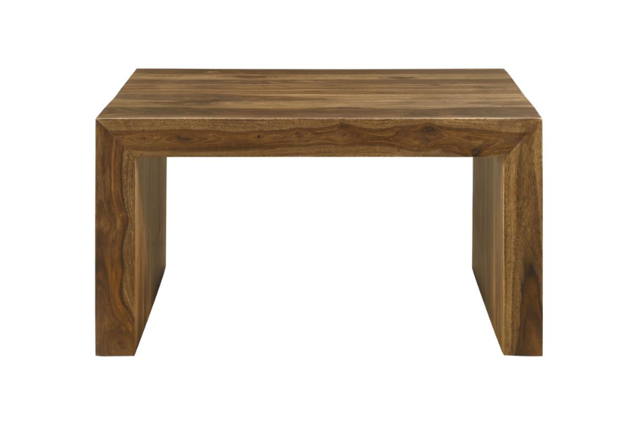 * Modernist U-shaped silhouette emphasizes elegance of simplicity * Sustainable solid sheesham wood highlighted with layers of color * Mitered corners add refined touch of craftsmanship * Beautiful wood brings earthy, organic energy to rustic square coffee table * No adornment needed to create inviting living room centerpiece |