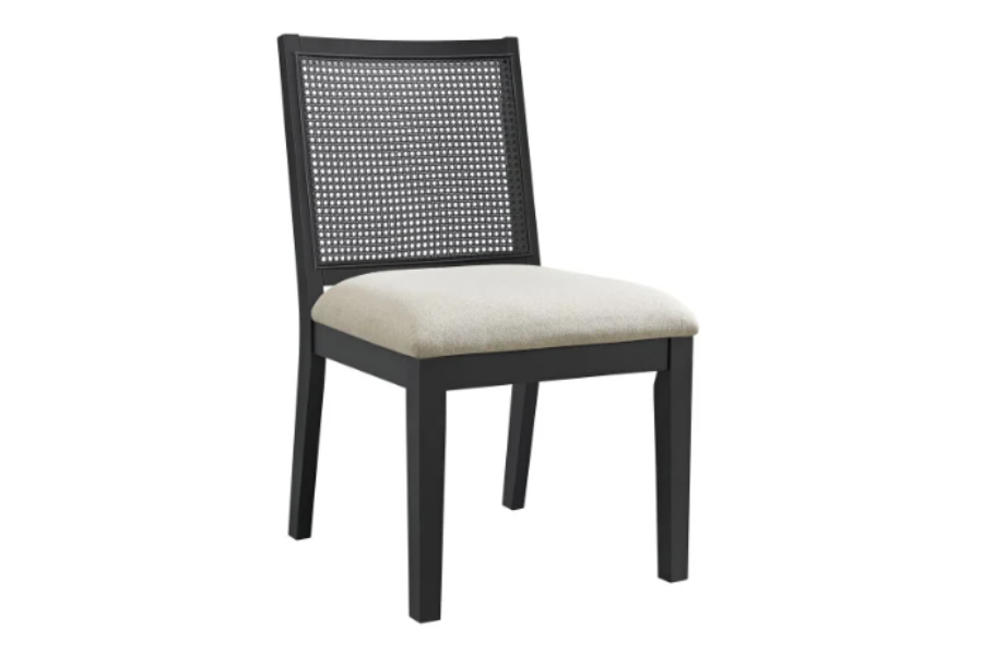 The Harrison Dining 2-pack Chairs feature sleek black frames of rubberwood solid construction. Woven faux rattan backrest panels add interest and support to chair backs, while beige fabric upholstery and foam cushions float on webbed suspension for exceptionally comfortable seating.