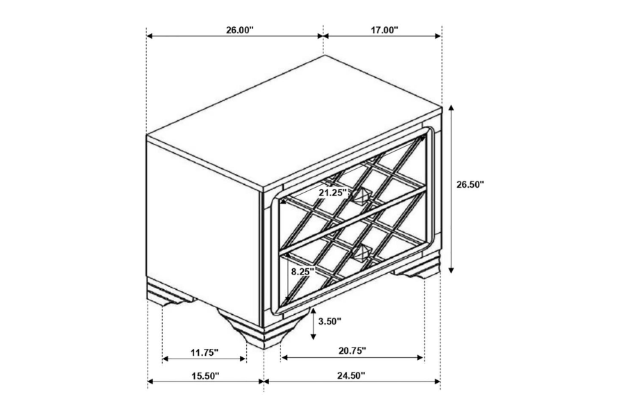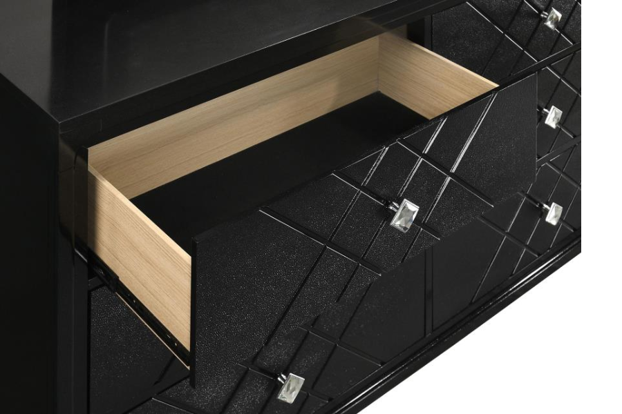 * Contemporary glam design with argyle pattern and an upholstered headboard * Acrylic bling knobs compliment the midnight star leatherette upholstery that is easy to maintain * Stingray embossed drawer fronts * Headboard and mirror feature blue LED touch lighting for ambiance * Metal ball bearing extension glides create stability and smooth operation |