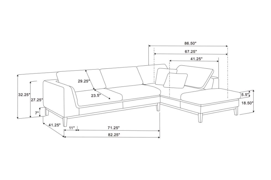 * Add a touch of mid-century modern to your space with the Persia Collection * This sectional has been perfectly paired with two pillows * This low profile 2-piece sectional is exceptionally tailored in a textured grey fabric accented with contrast blanket stitching in beige * Equally appealing is the beige platform base framed with tall tapered legs |