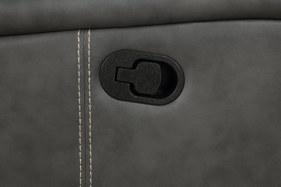 * Mixed motifs suit both modern and transitional living spaces in need of a three-piece sofa set * Enjoy prolonged hours of relaxation and comfortable seating with manual reclining * Trending grey leatherette upholstery with decorative topstitching adds easy-care and maintenance * Ample plush foam filling distributes perfectly to support different body positions * A loveseat storage console flips open to reveal storage space for remotes and accessories * Keep beverages within easy reach with two metal cupholders in front of the loveseat console * Adjust your seating position with ease using the pull handle located on the side panel  |