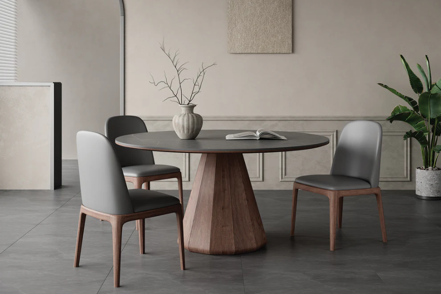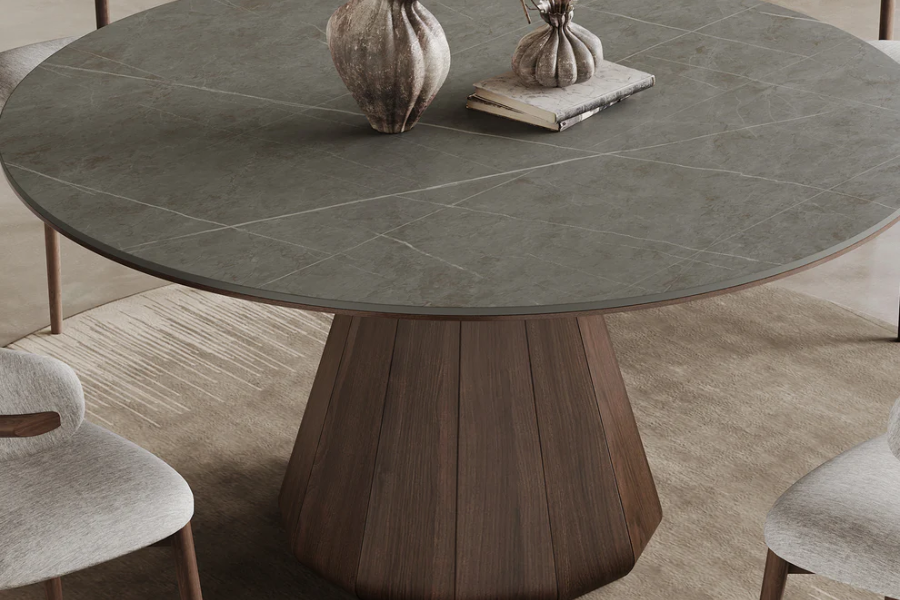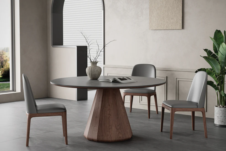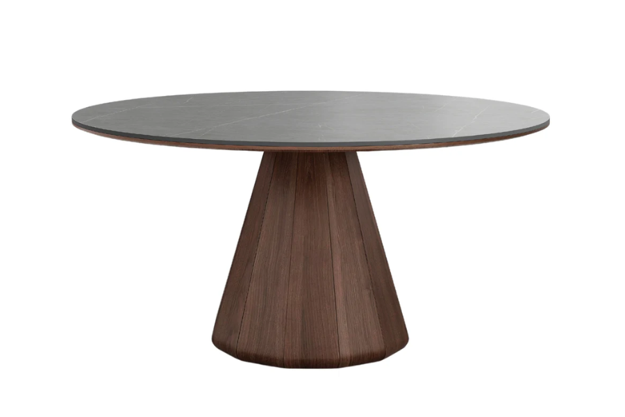 The Casabianca Home Eric 53 in round dining table with walnut base and gray marbled ceramic top offers a blend of adaptable style and comfort boasting a modern design that seamlessly complements your dining room decor.