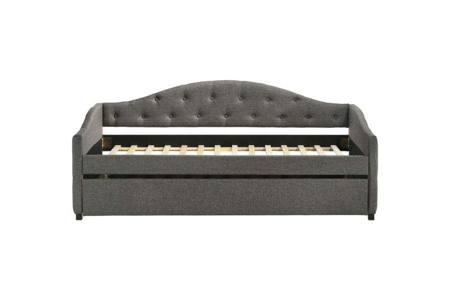 * A transitional camel back with button tufted detailing, creates a cozy focal point for any guest room or smaller sized area * Functional convenient pull out trundle for an extra sleep space when needed * Upholstered in a versatile grey fabric * Constructed with poplar and MDF * Slat kits included |