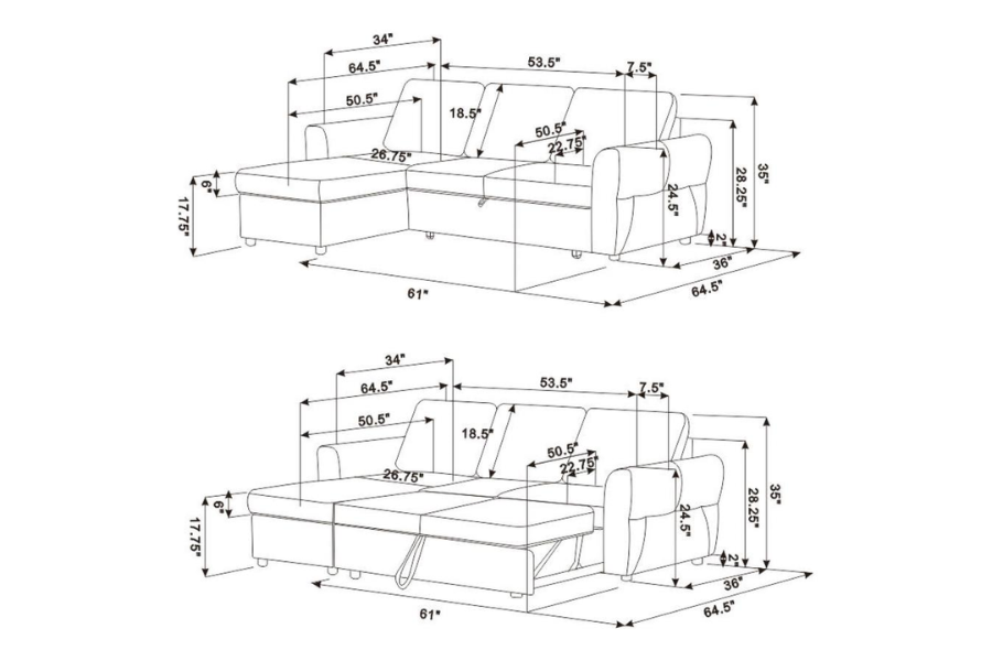* Sleeper function and removable back cushions provide convenience and style * Rolled arms and end lounge unit create livability and seating comfort * Poly fiber and foam filled cushions offer supreme support and comfort * Soft fabric upholstery and pine wood framing complement contemporary spaces * Sleeper sectional provides seating and lounging comfort |