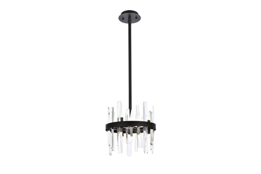 Modern crystal chandelier features top and bottom tier crystal prisms staggered along the wrought iron frame. The thick metal frame wraps around top grade crystal prisms ensure it is built to last, definitely worth it. Hang this work of art and dim the lights for a bit of sophisticated lighting in your home. Get lost in a beautiful light and sleek design available in multiple finishes. The hanging rod conveniently comes with a slope ceiling adapter, perfect for your vaulted or angled ceiling.