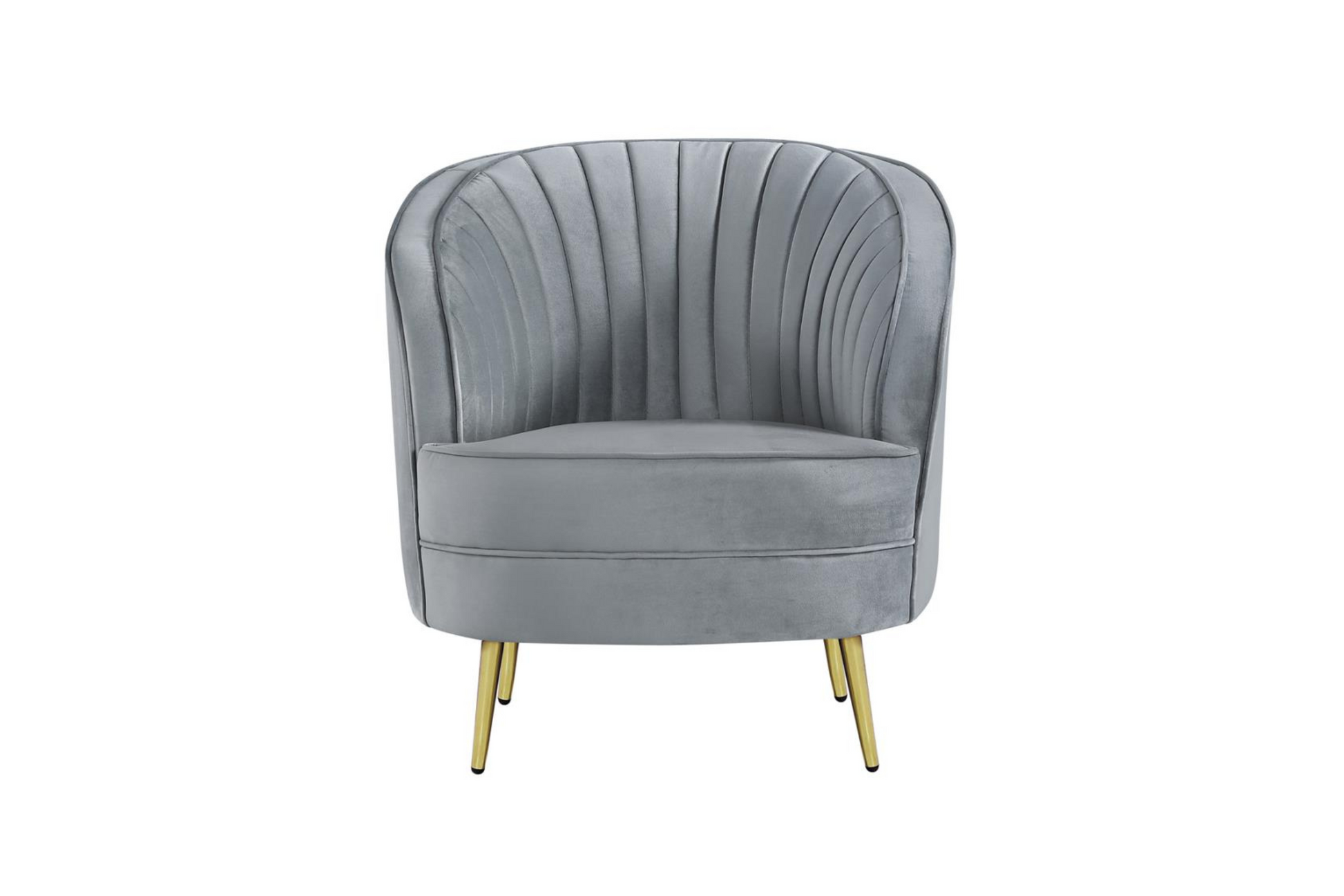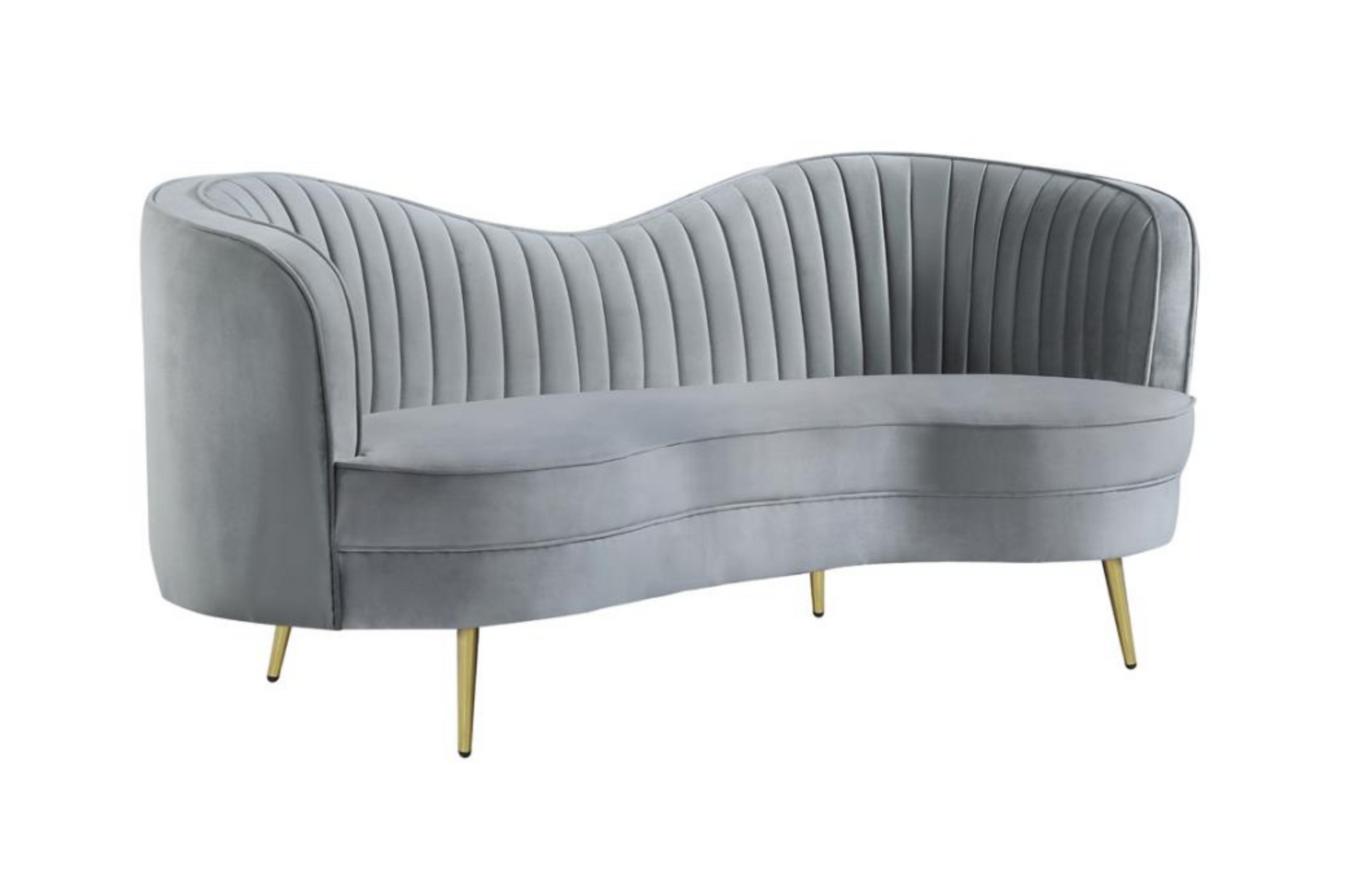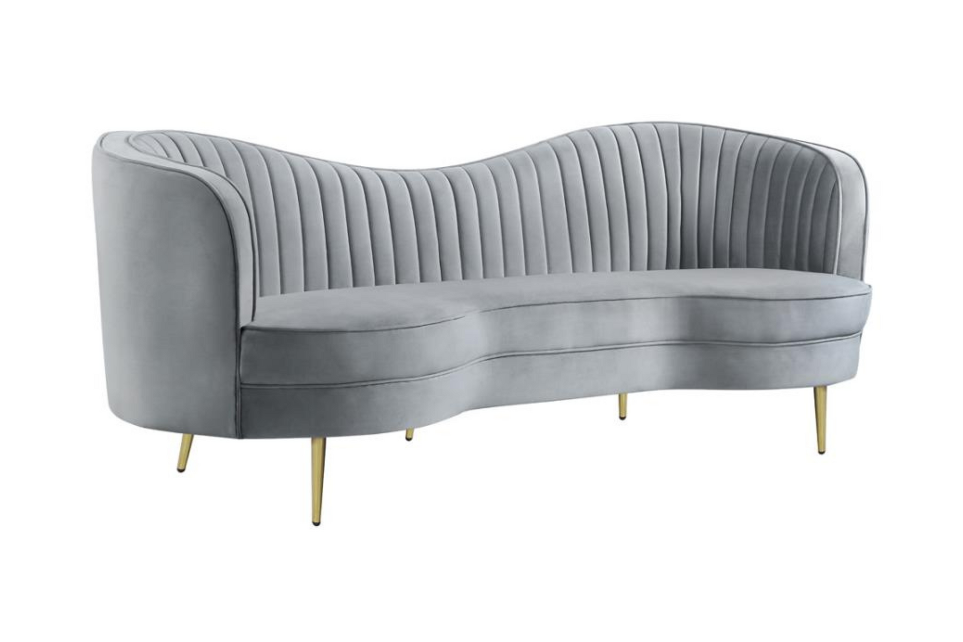 | - Sculptural modern glam in a luxurious grey velvet - Both sofa and loveseat feature an inverted camel back creating the right touch of curve appeal - Tailored, vertical channels frame inside back providing a stylish back drop to the kidney shaped attached bench seat - Gold stainless steel tapered legs add the perfect finishing touch |