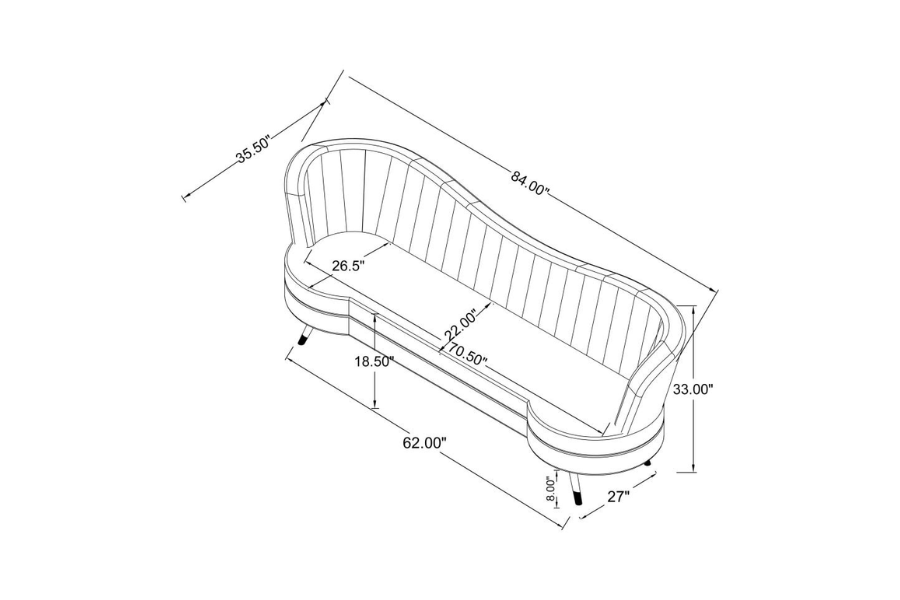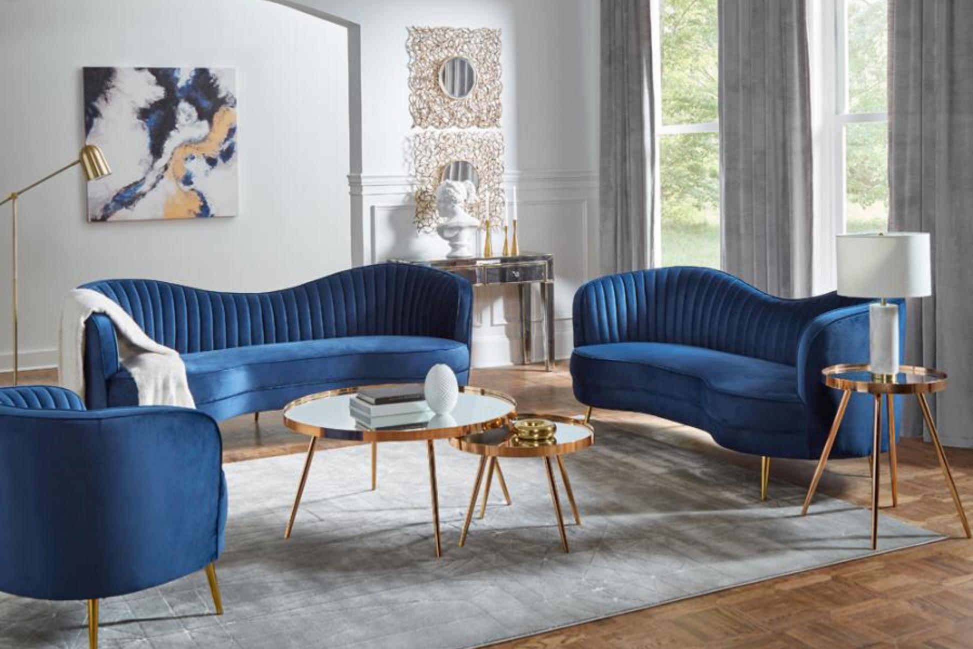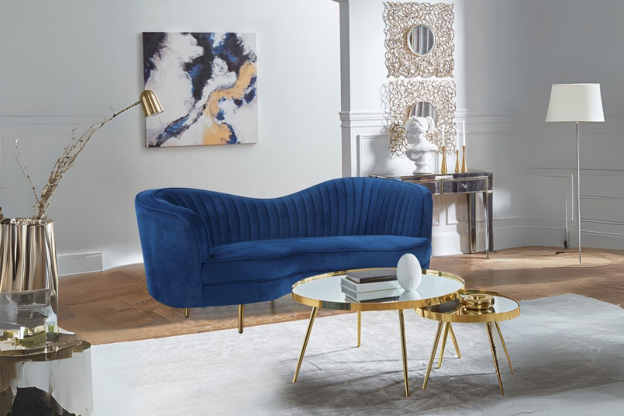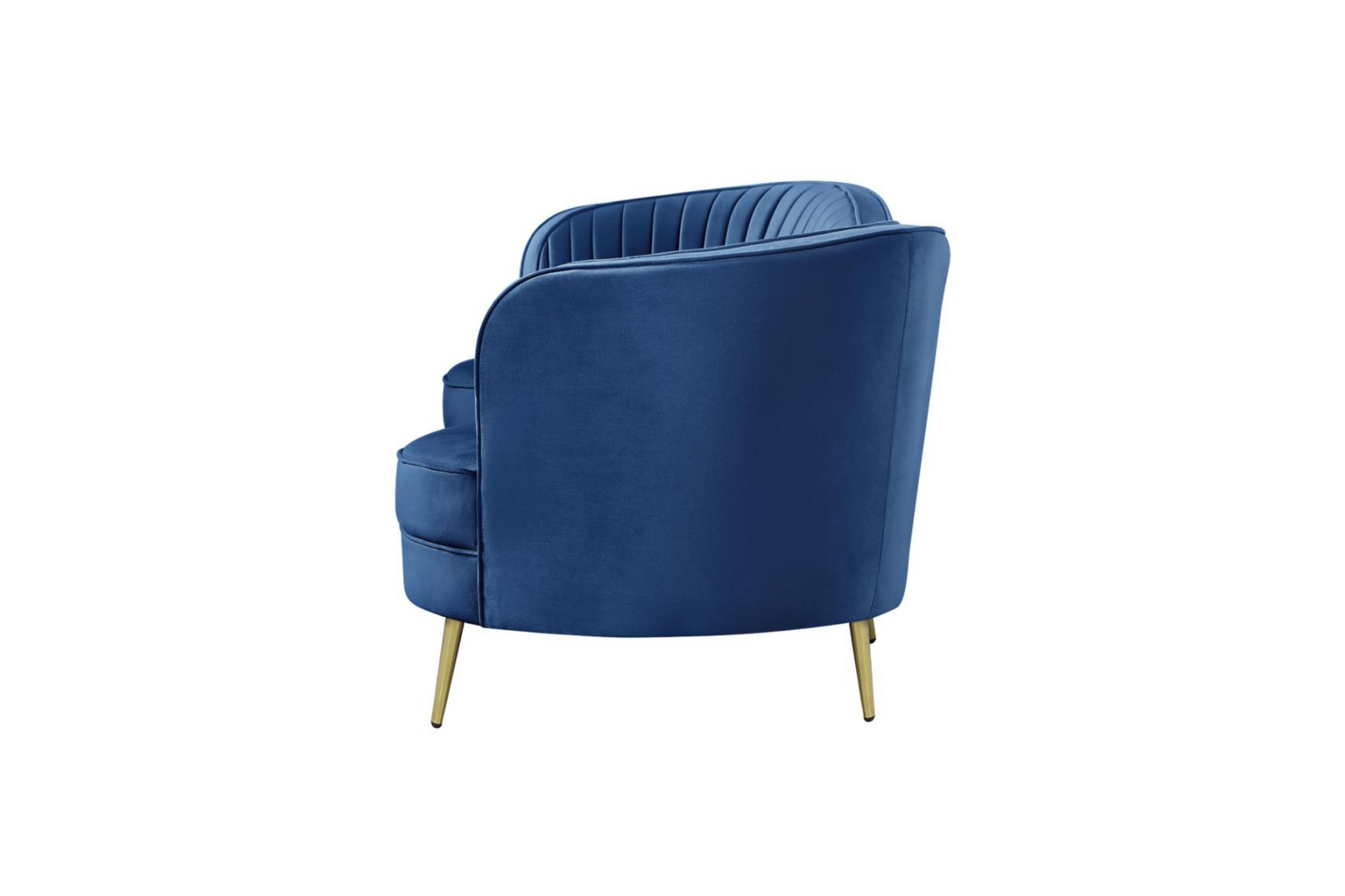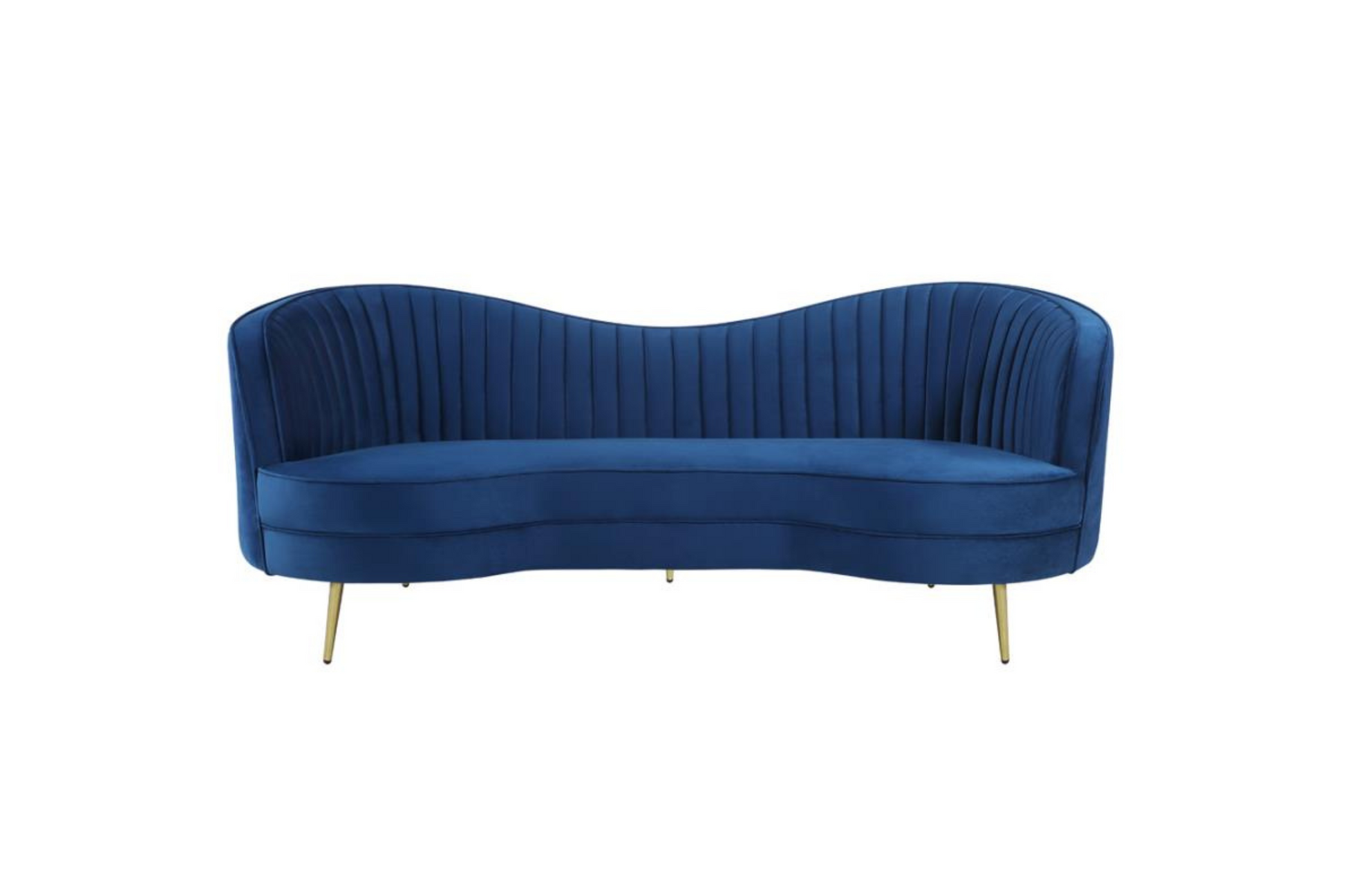 With an Art Deco flair, this retro-inspired sofa offers a striking curvy silhouette with a bold colored fabric. Wrapped entirely in a bright blue velvet that is super-soft to the touch, this contemporary sofa presents itself as the focal piece in your seating area. With a channel tufted interior cushions and kidney-shaped bench cushion, this tuxedo-inspired sofa offers a twist on a timeless iconic style. An inverted camelback silhouette with gleaming gold tapered legs lend a mid-century flair. Complete your seating ensemble with an available matching loveseat and barrel-shape chair.