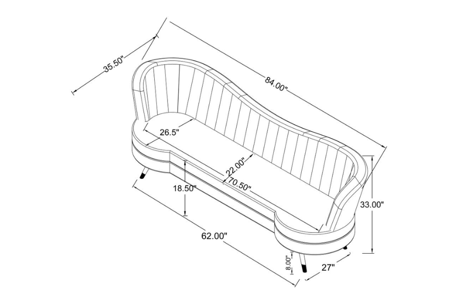 * Sculptural modern glam in a luxurious grey velvet * Feature an inverted camel back creating the right touch of curve appeal * Tailored, vertical channels frame inside back providing a stylish back drop to the kidney shaped attached bench seat * Gold stainless steel tapered legs add the perfect finishing touch |