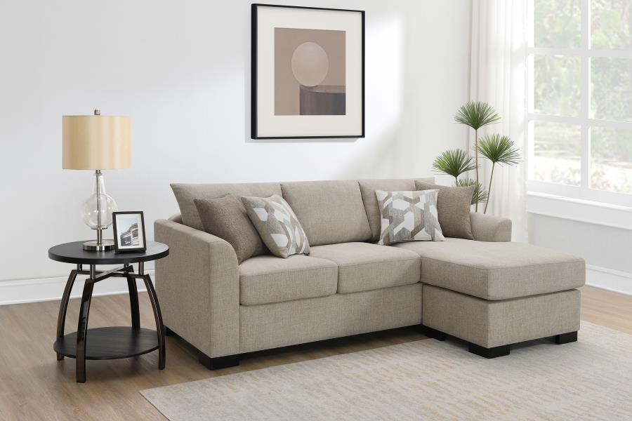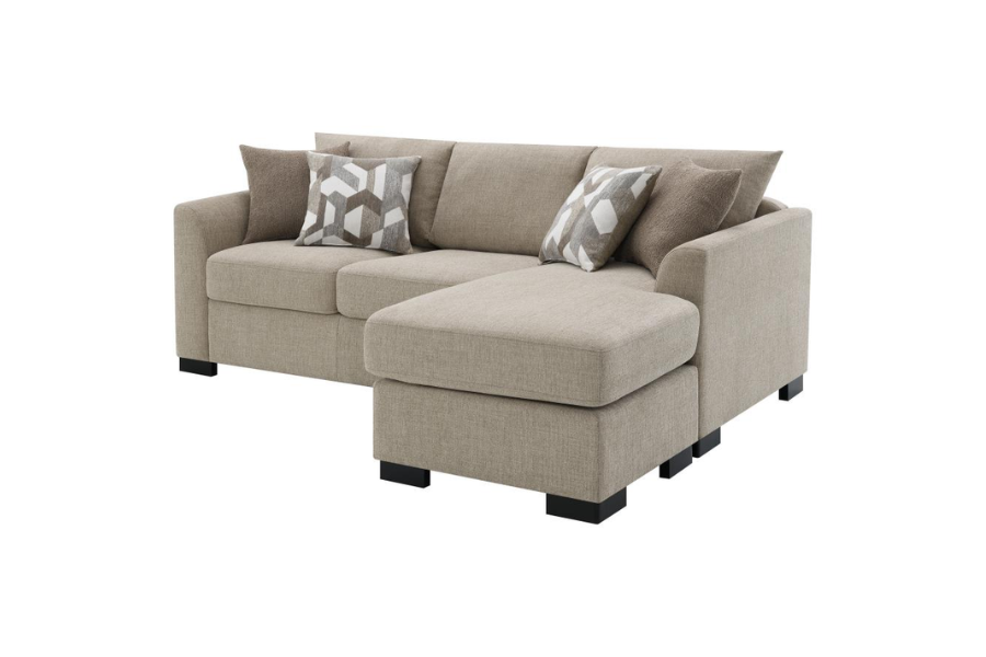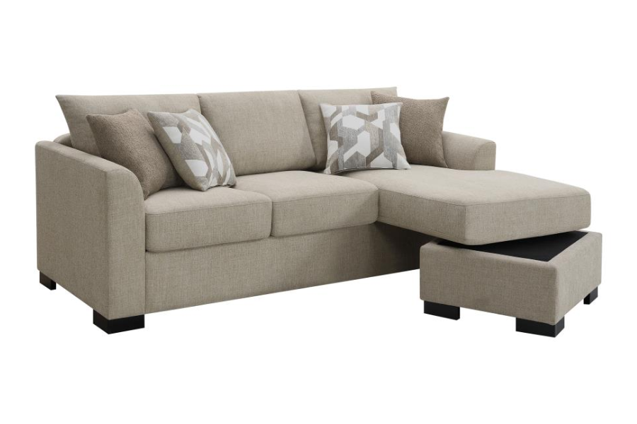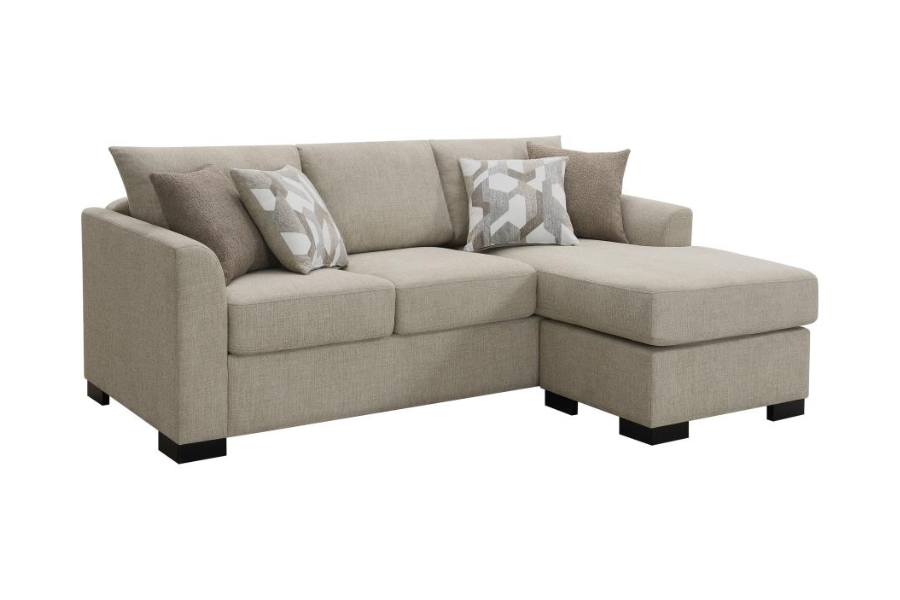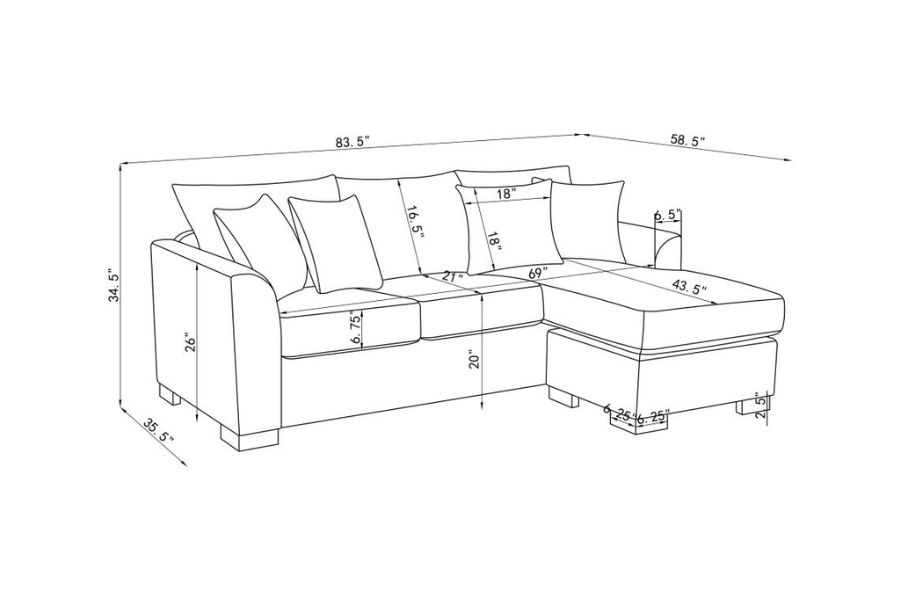 * Modern sleeper sectional includes a chaise for optimal versatility and relaxation * Four accent pillows with geometric patterns are included to complement neutral, modern upholstery * Fully encased solid and engineered wood frame provides lasting durability and reliability * Seat cushions are removable and back cushions are reversible for added versatility and comfort * Seats feature pocket coils, creating a spring base for durability and comfort in your home |