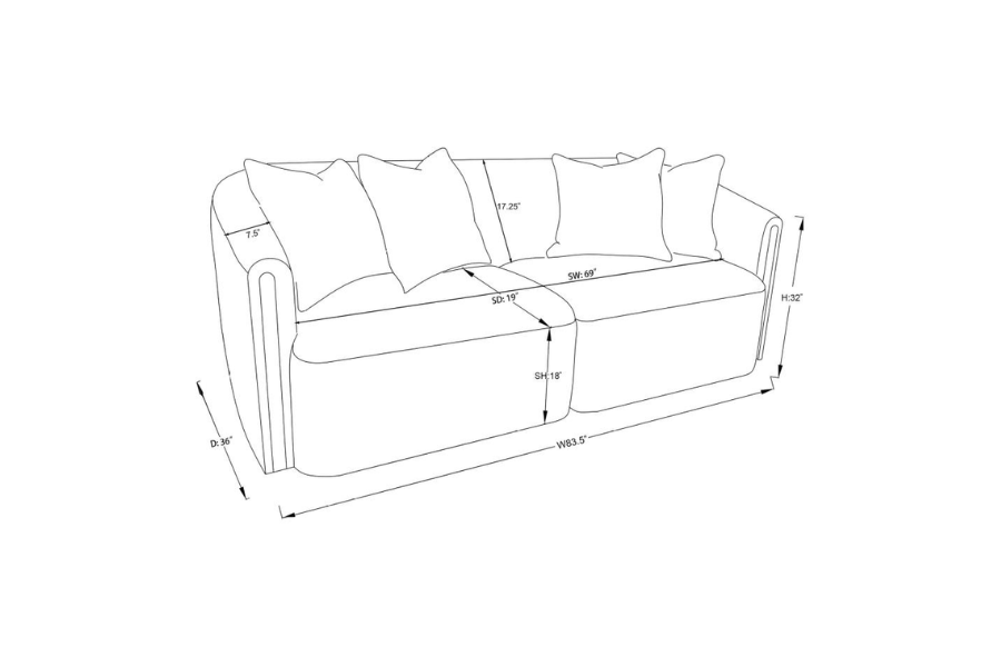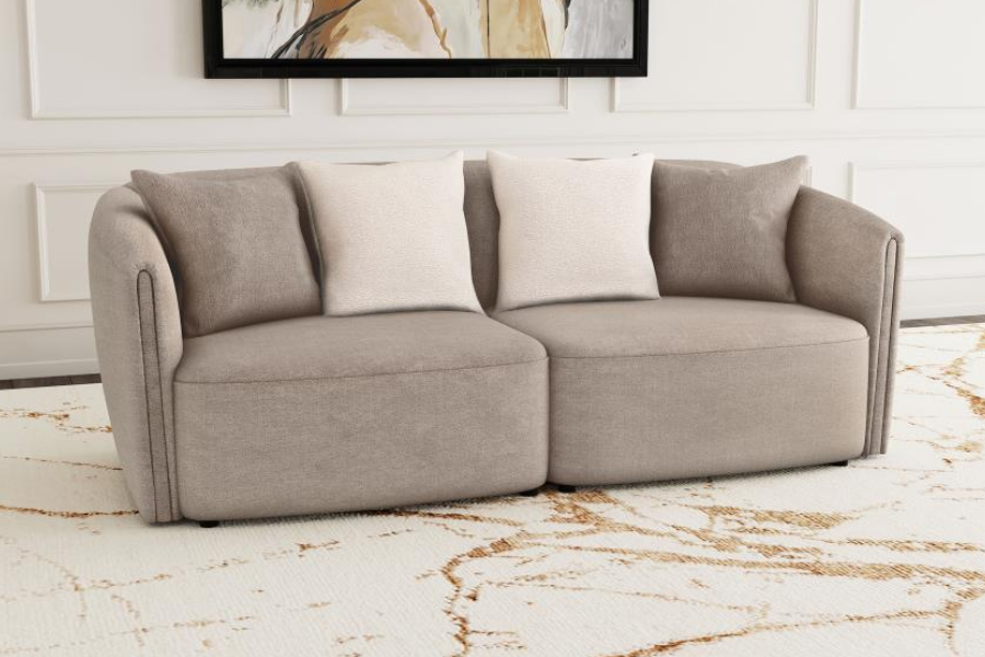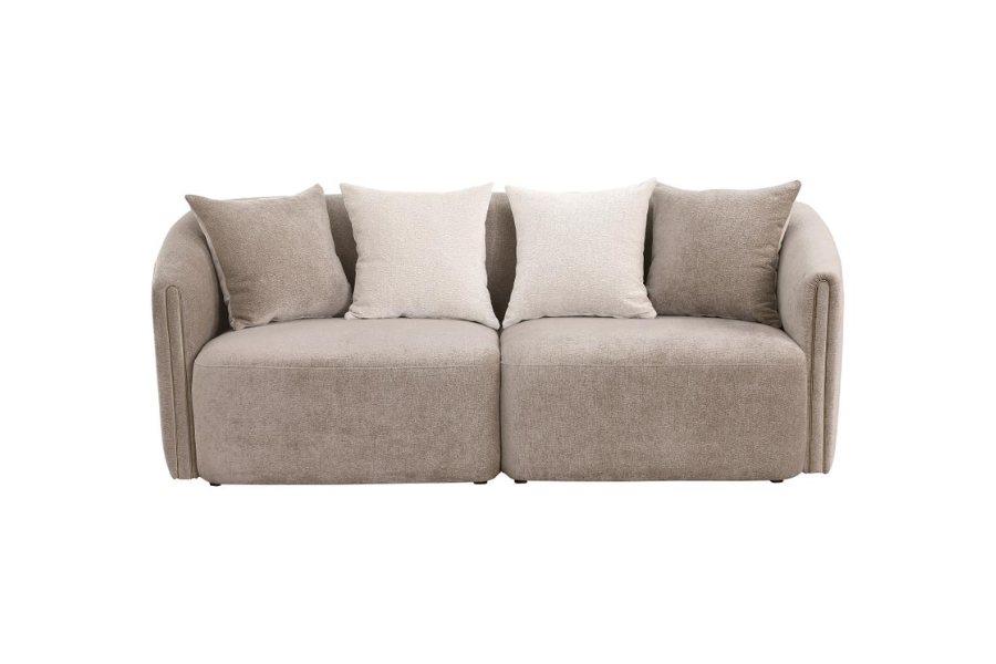 * Neutral latte upholstery adds understated allure to a modern sofa with plush foam cushions * Curved shelter back and rounded arms are complemented with upholstery with a slight wavy pattern * Fully encased solid and engineered wood frame provides lasting durability and reliability * Features attached cushions with accent pillows included for added comfort and flexibility * Seats feature pocket coils and sinuous springs, creating durability and comfort in your home |
