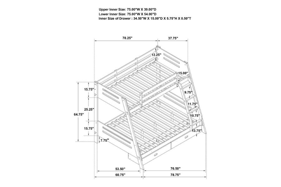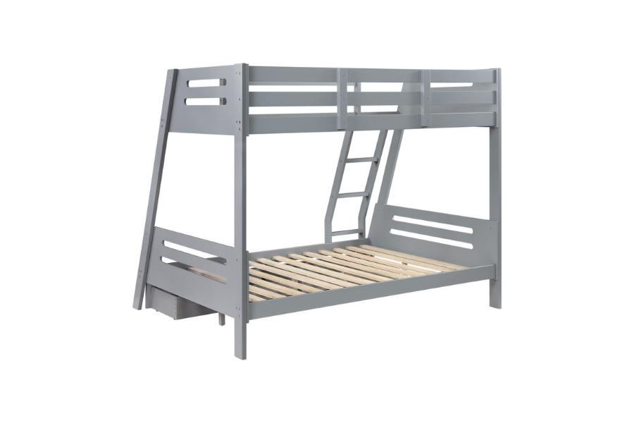 * Twin-over-full bed design creates variety that adds versatility for siblings, sleepovers, and guests * Modern grey finish complements in any space, offering a contemporary neutral color palette * Upper bunk includes safety rails and a reversible ladder for safer sleeping and easy access * Rounded grooves add dimension to head and footboards, lightening the overall look * Two storage drawers add functionality, ideal for clothing, toys, linens, and more |