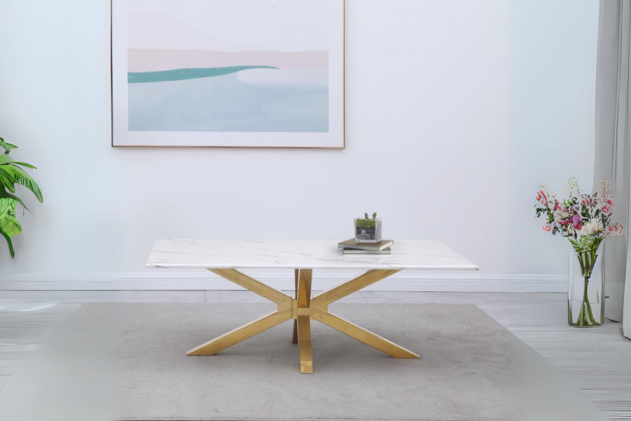 | * Luxurious elegance infuses a modern rectangular coffee table with sophistication * Star-shaped pedestal base in gold creates sculptural appeal in a glam living room * Luxe white marble tabletop features distinctive veining and patterns that bring depth and dimension * Straight tabletop edge is clean and precise to complement existing decor * Legs feature levelers to ensure that the table doesn't rock or move unexpectedly |