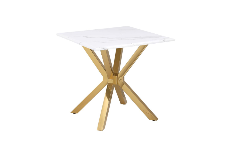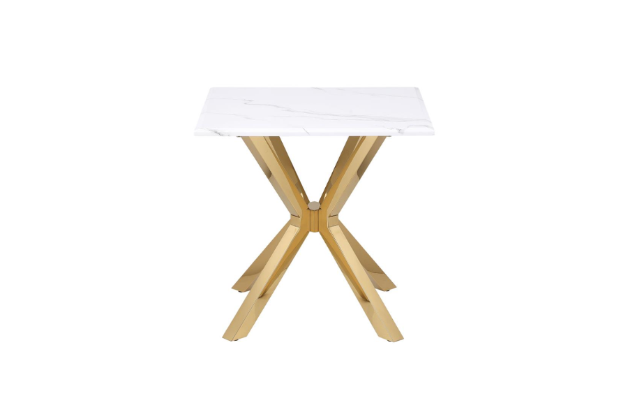 * Luxurious elegance infuses a modern rectangular end table with sophistication * Star-shaped pedestal base in gold creates sculptural appeal in a glam living room * Luxe white marble tabletop features distinctive veining and patterns that bring depth and dimension * Beveled tabletop edge adds elegance and dimension to sharp corners * Legs feature levelers to ensure that the table doesn't rock or move unexpectedly |