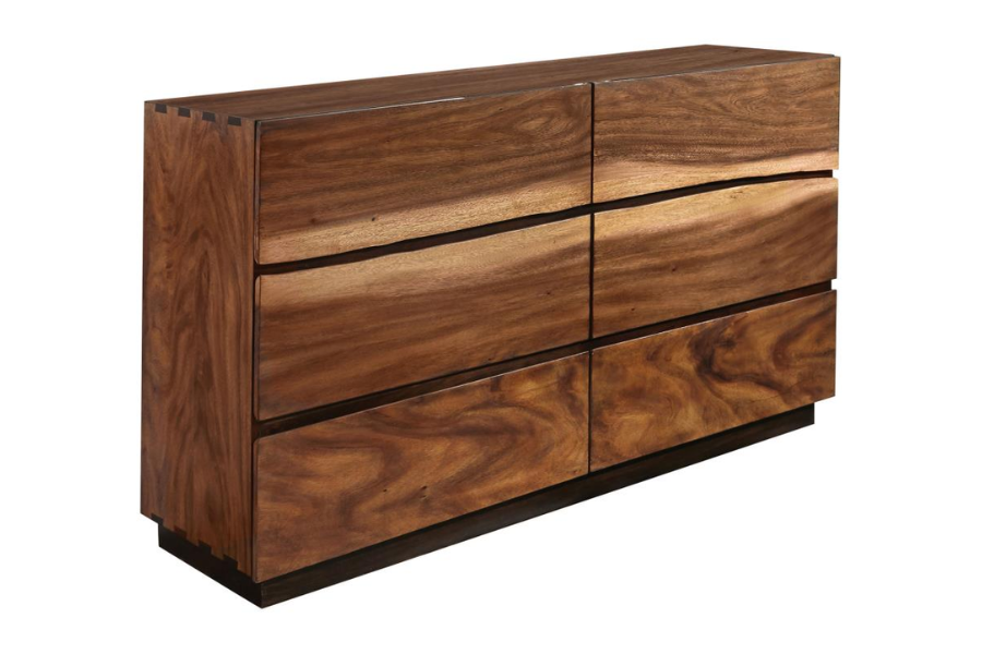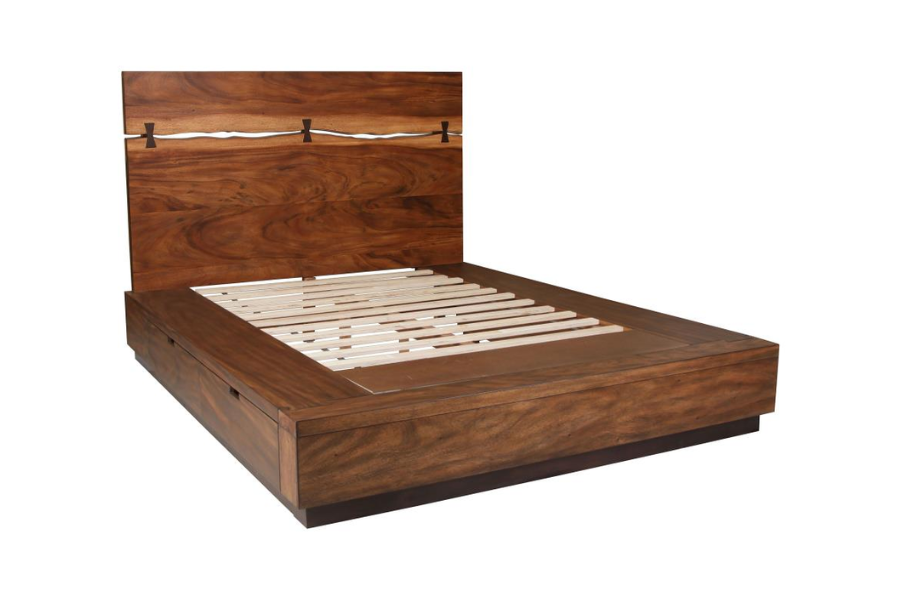 * Rooted in beautiful craftsmanship and true to the live edge movement, Madden collection is a stunning gift of nature * Featuring full-tree slab veneers with natural exotic variances, exposed dovetail joinery, floating bases and walnut bow tie inlays * Platform beds without storage * Fingertip pull drawers * Top right drawer of dresser includes a removable jewelry tray * Exclusive Coaster design |