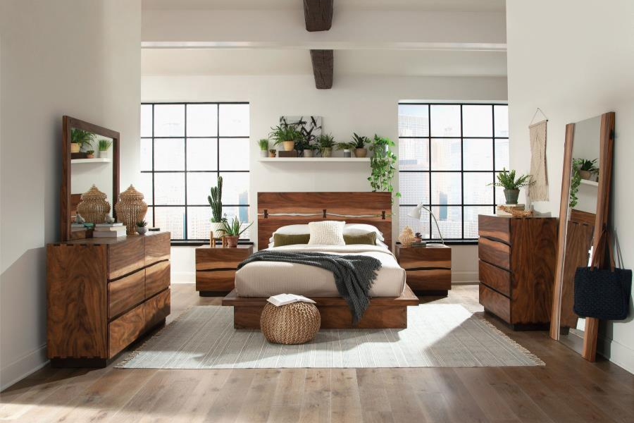 | * Rooted in beautiful craftsmanship and true to the live edge movement, Madden collection is a stunning gift of nature * Featuring full-tree slab veneers with natural exotic variances, exposed dovetail joinery, floating bases and walnut bow tie inlays * Fingertip pull drawers * Top right drawer of dresser includes a removable jewelry tray * Exclusive Coaster design |