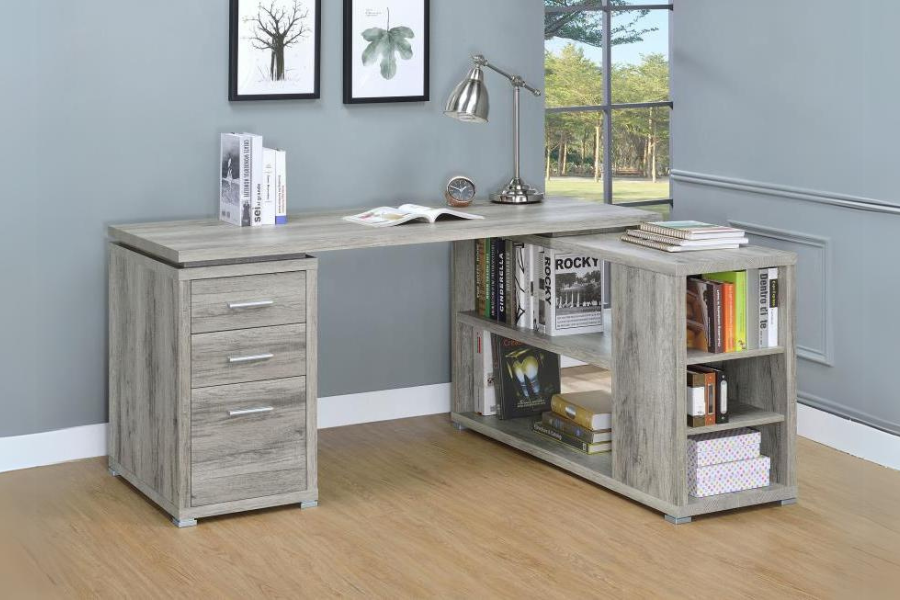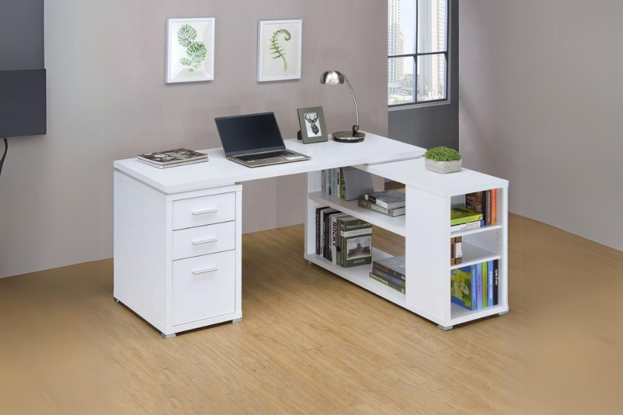 * L-shape office desk with articulating return in white finish * Features multiple storage options including two drawers and a file cabinet * Built-in file cabinet holds legal or letter size files * Reversible set-up possible * MDF, particle board, and laminate construction * Also available in cappuccino, weathered grey, and grey driftwood |