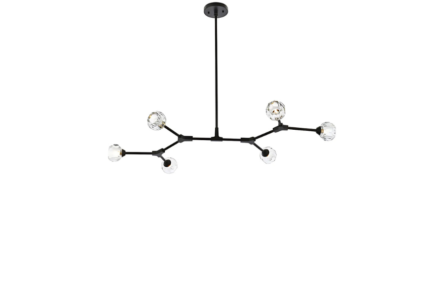 Crafted from iron metal and crystal, it features a round ceiling canopy, a hanging rod of 46 inch long, and arms extended with a solid K9 crystal ball from rods at all angles for a modern and linear look. Each 20W G9 bulb ( not included) is diffused by a faceted clear crystal ball giving the fixture a touch of industrial and glam inspiration. This work of art will add an artful focal point to your entryway, dining room, kitchen, or office. Evoking a sophisticated and timeless aesthetic to any space and will be an instant conversation started with its finely faceted crystal sphere which is polished by hand to reflect and refract light. Available in three different finishes in gold, chrome, and black.